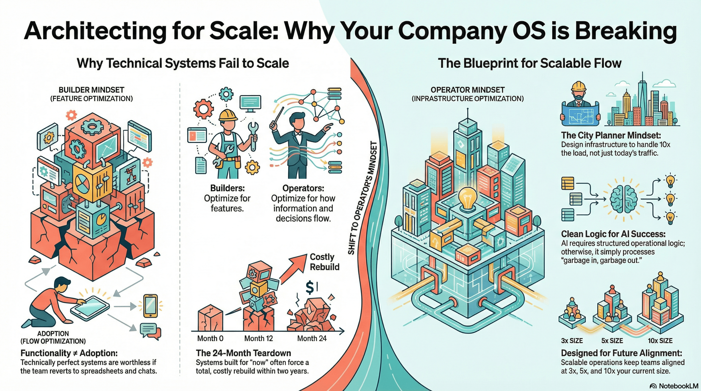 🔹 A limited view creates a limited system. When someone who has never scaled a business builds your operating system, they build it from the perspective of a builder, not an operator. They optimize for features. Operators optimize for flow…how information moves, how decisions get made, how teams stay aligned at 3x, 5x, and 10x your current size.