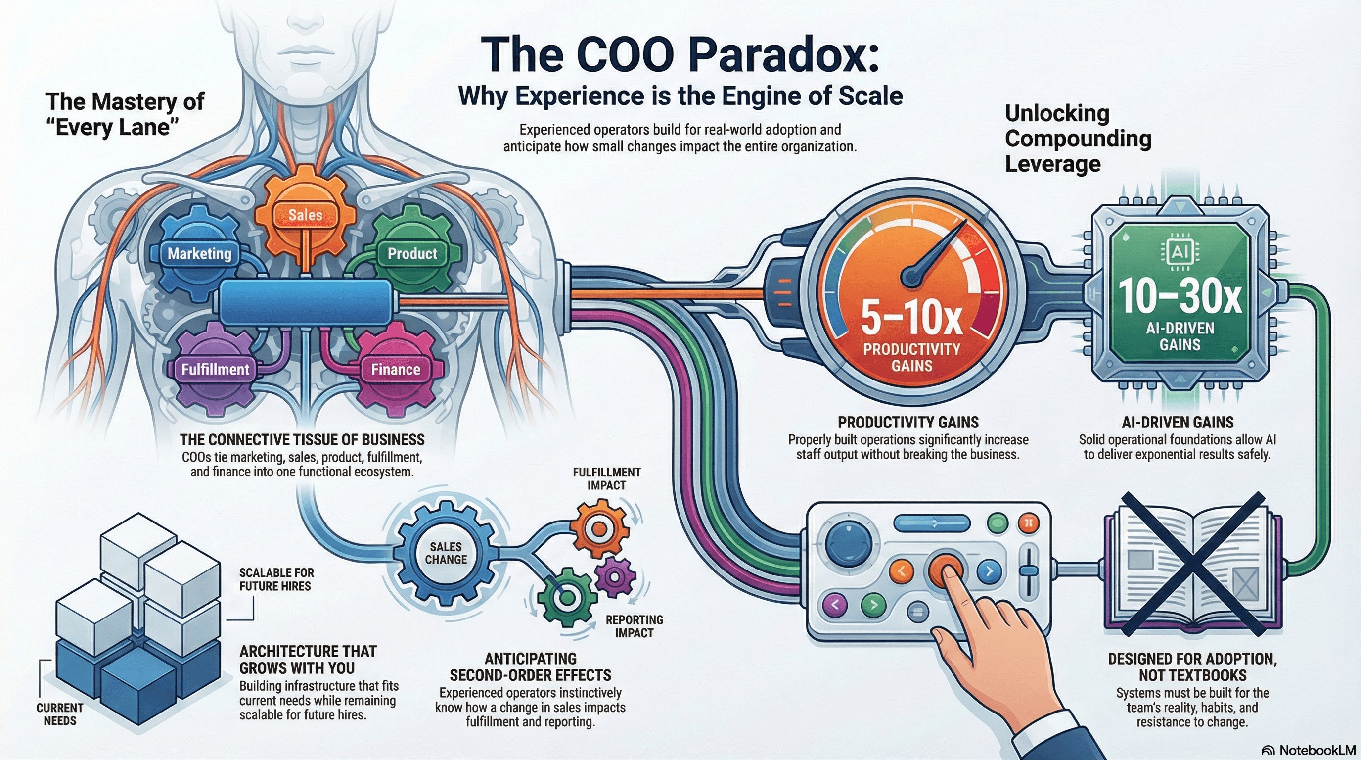 The COO is the connective tissue of the entire business tying marketing, sales, product, fulfillment, and finance together into an ecosystem that actually works.