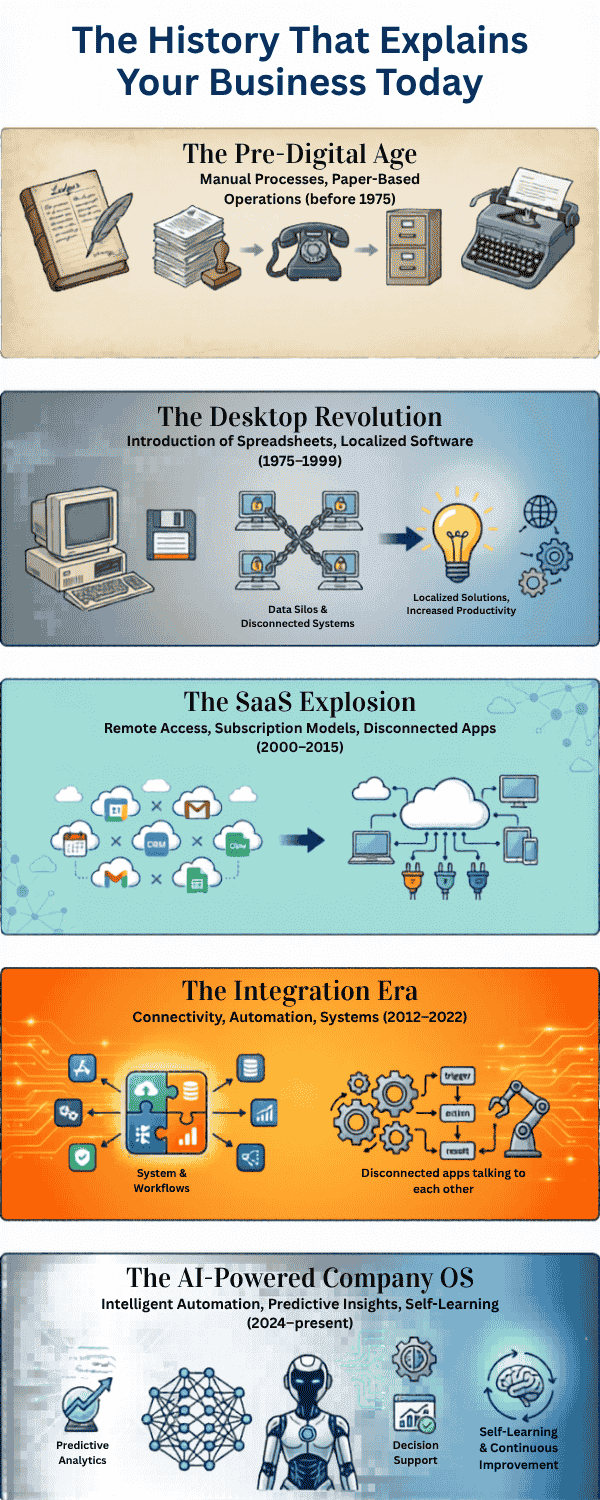 Business operations has evolved through five distinct eras. Each one solved the problem created by the era before it. Each one created a new problem. And the current era, for the first time in history, is solving the foundational problem all five eras were circling.